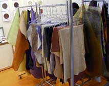 こちらは革1枚づつの展示です。ラメや金泊をプリントしたものや、パール加工したモノ、他様々な加工をされたピッグスキンたち。1枚の革の形を見るのが初めて、というお客様もいらっしゃいました。素材に関するお問い合わせもいただき今回の皮革展示は好評でした。