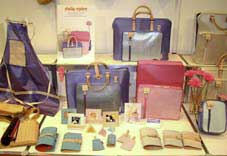 新商品サンプルの一部。モバイル対応のバッグ類に沢山のお声をかけていただきました。さまざまな加工によるピッグスキンの多彩な表情が好評です。ギフトショーでいただいたご意見を商品に生かして、更にグレードアップを図ります。
