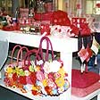 赤が基調のコーナー。テーブルの」上にあるものはほとんどローソク用の器や飾り。写真たてや小さなクッション、テーブルセンターなどなどありとあらゆる装飾品。強烈な造花だらけの麦わらバックも。