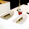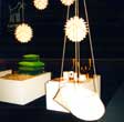 創立3年 目を引いたのは二人の後ろにあるライト。と1-18に写っているゆりかご。照明器具はA4版くらいの箱にすっかり入ってしまうモジュールを自分で組み立てる。薄い照明用樹脂板をカットした69枚のユニットからできていて道具なしで組み立てられる。この照明具“Norm69”は1969年に建築家サイモン・カルコフが設計したもの。ゆりかごはフェルト製で上からつるせるような形でできていて、必要最低限の面でできており温かみのある手縫い風の仕上げ。