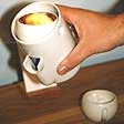 磁器のポットに木のカバーを付けいわゆる取っ手の部分がないポット。